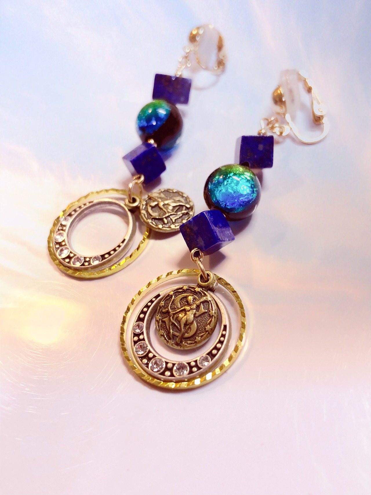 AAAラピスラズリとホタルガラス、アメリカ銅金属店製オリジナル射手座チャームを使用して、独自に組み上げたオリジナルイヤリングになります。