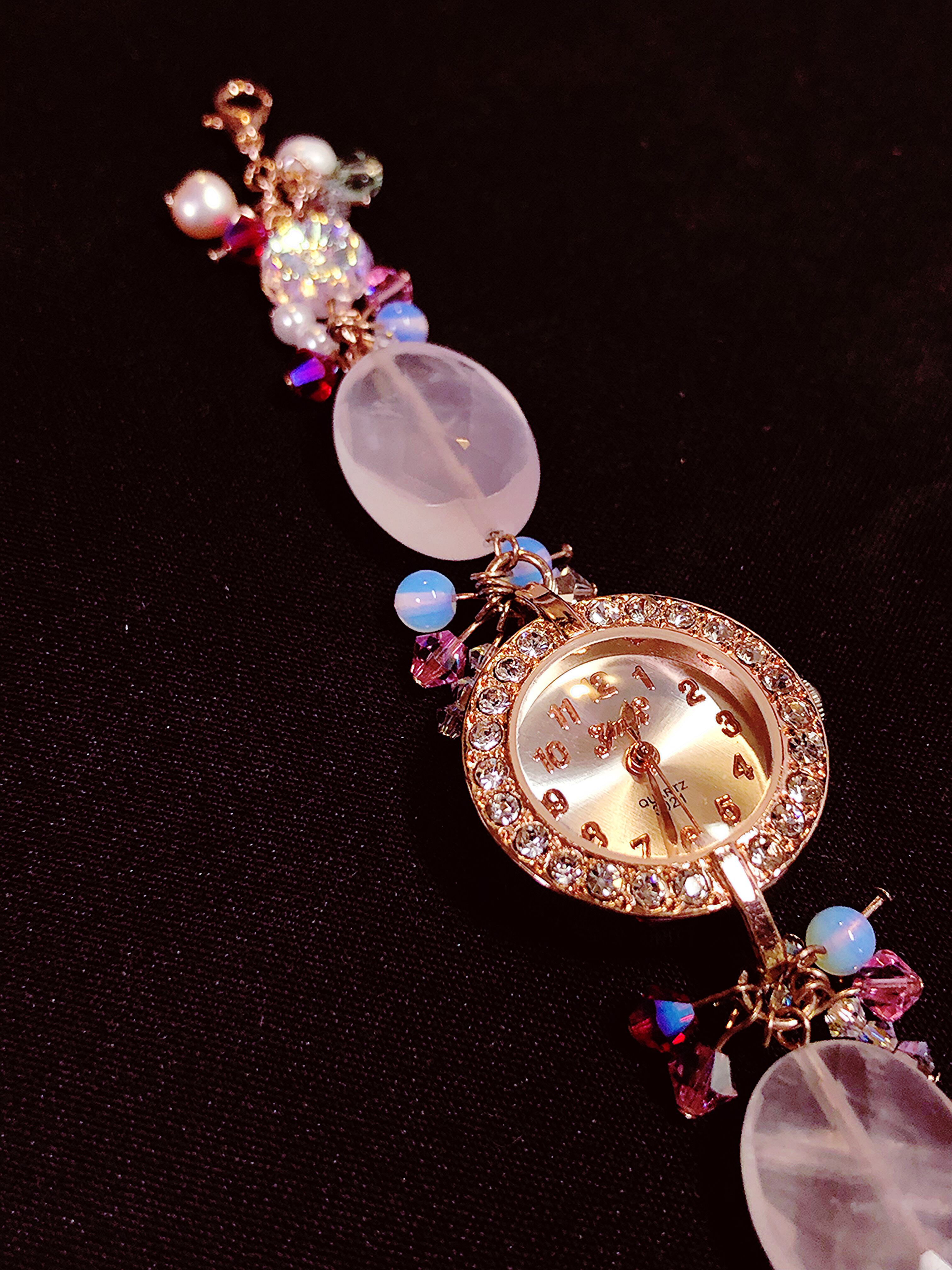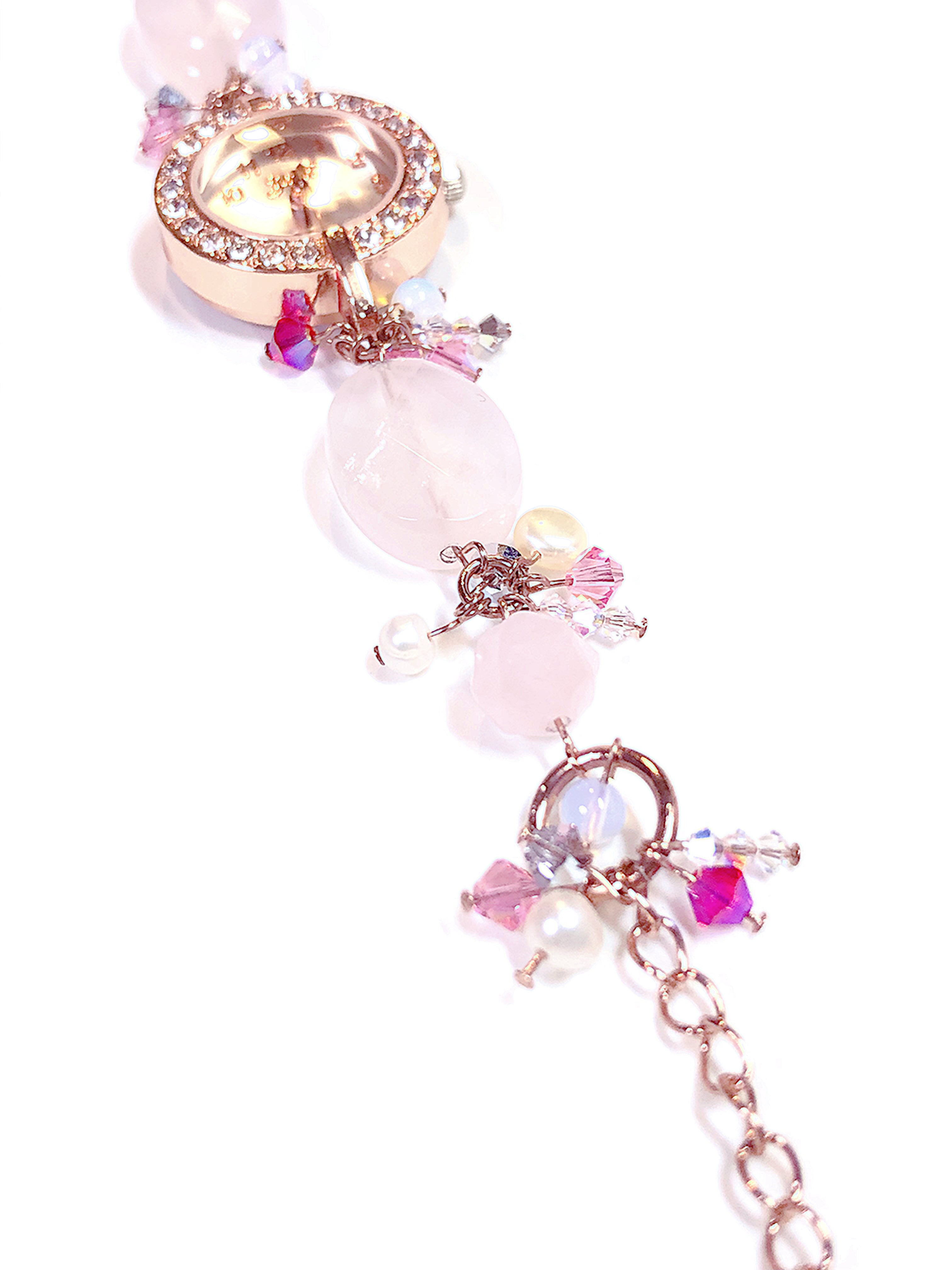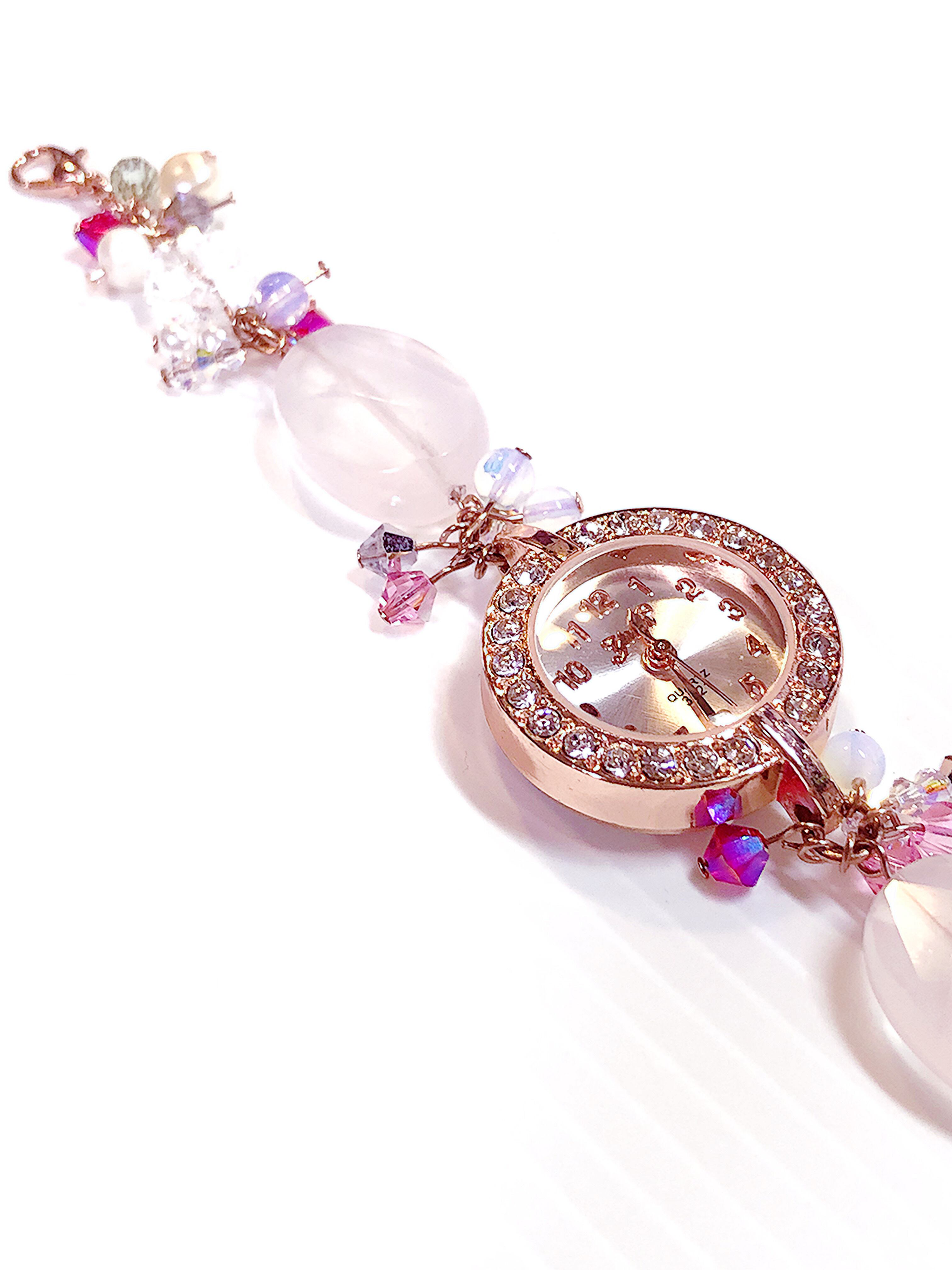 ローズクォーツ・淡水パール・スワロフスキーをメインに組み合わせた、オリジナルのブレスレットタイプの腕時計(電池内蔵・動作確認済み)になります。