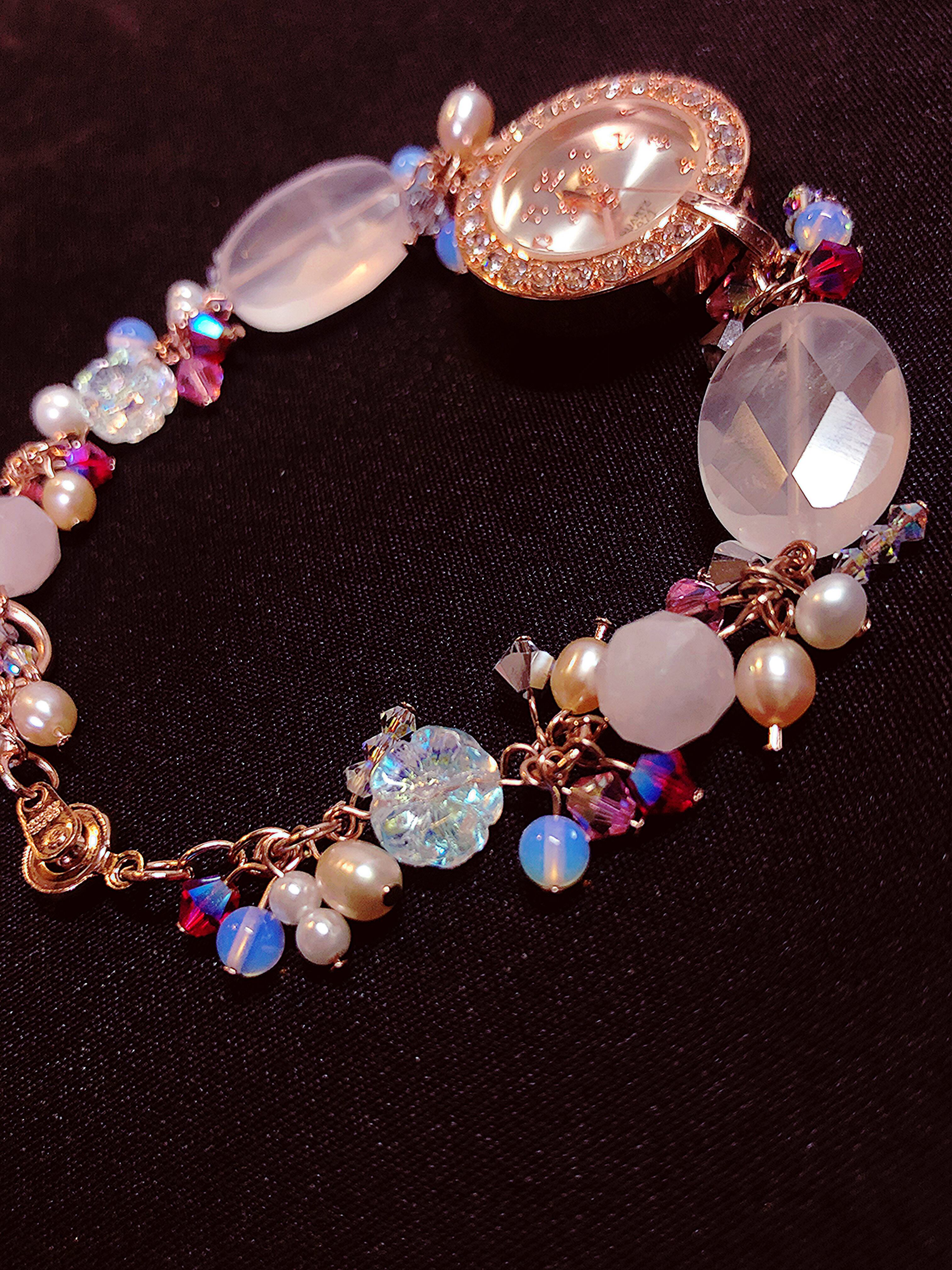 ローズクォーツ・淡水パール・スワロフスキーをメインに組み合わせた、オリジナルのブレスレットタイプの腕時計(電池内蔵・動作確認済み)になります。