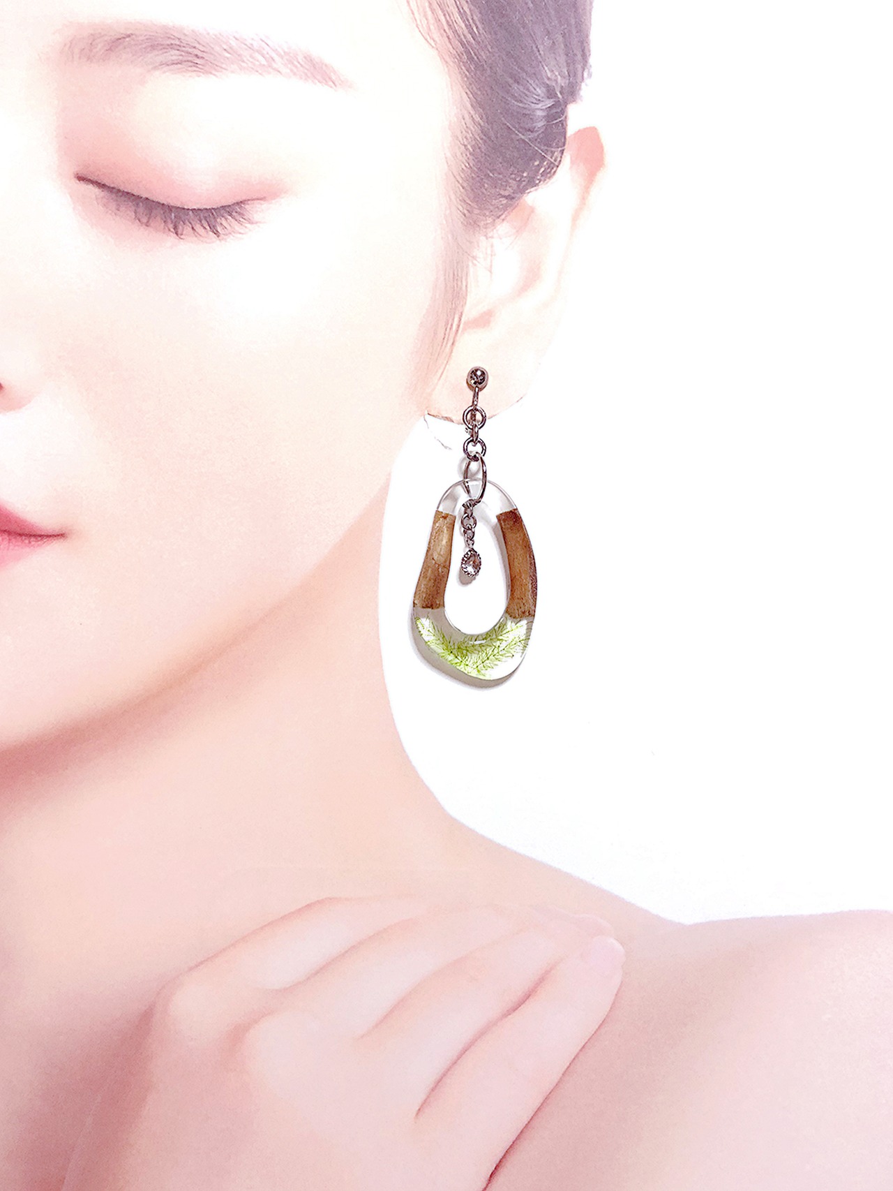 木とレジン、そして小さなシダ系の葉を組み合わせたオリジナルレジンアクセサリーになります。