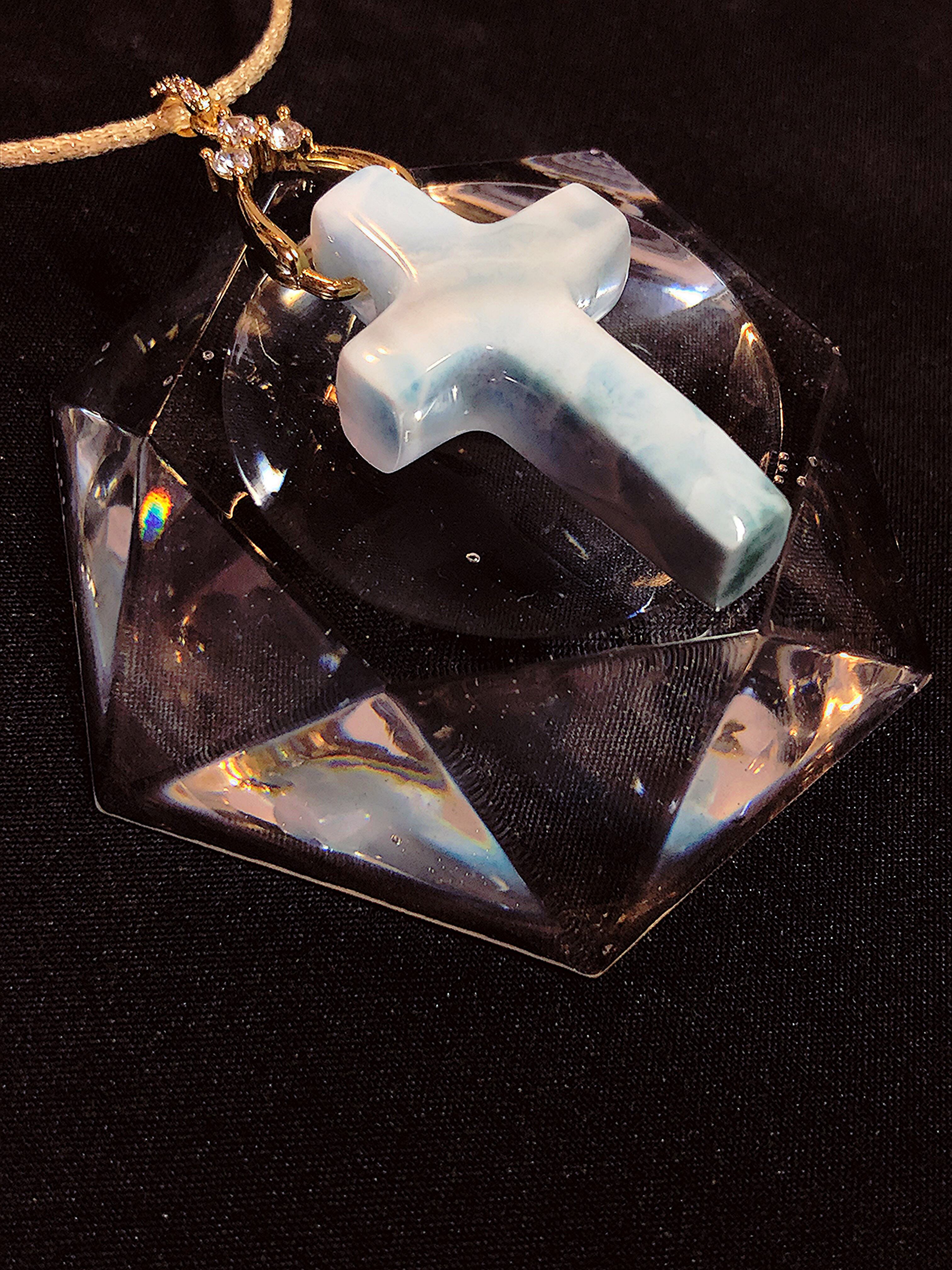 ラリマーを十字架形にカット・研磨を重ねたトップに、キュービックジルコニアバチカンを組み合わせたオリジナルネックレスになります。