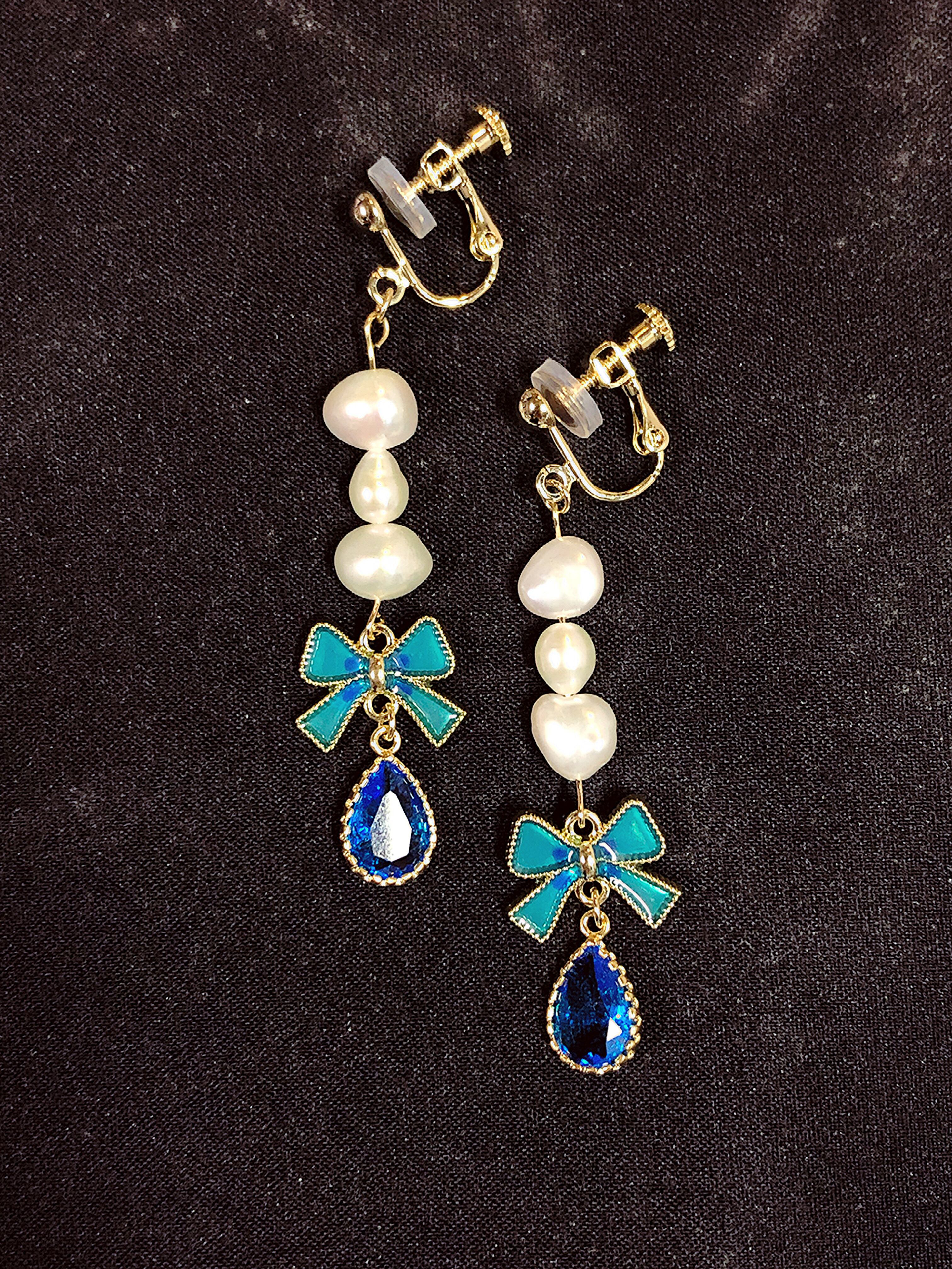 ビジュー製のリボンに、各種淡水パール・マザーオブパールを組み合わせた、煌びやかなオリジナルアクセサリーになります。