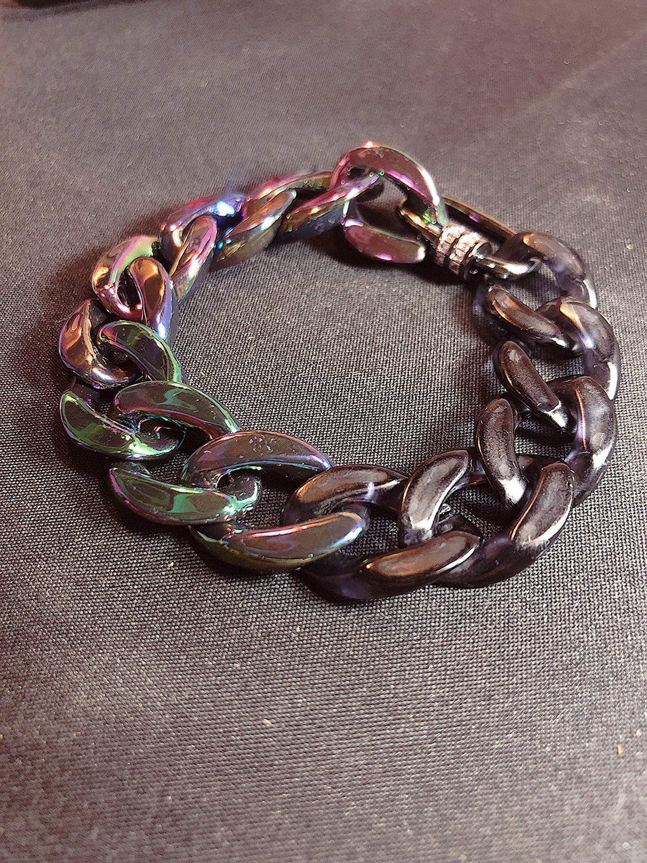 金属テイストの喜平チェーンに、石付きのカラビナを組み合わせた見た目に重厚感のあるアクリルチェーンブレスレットになります。