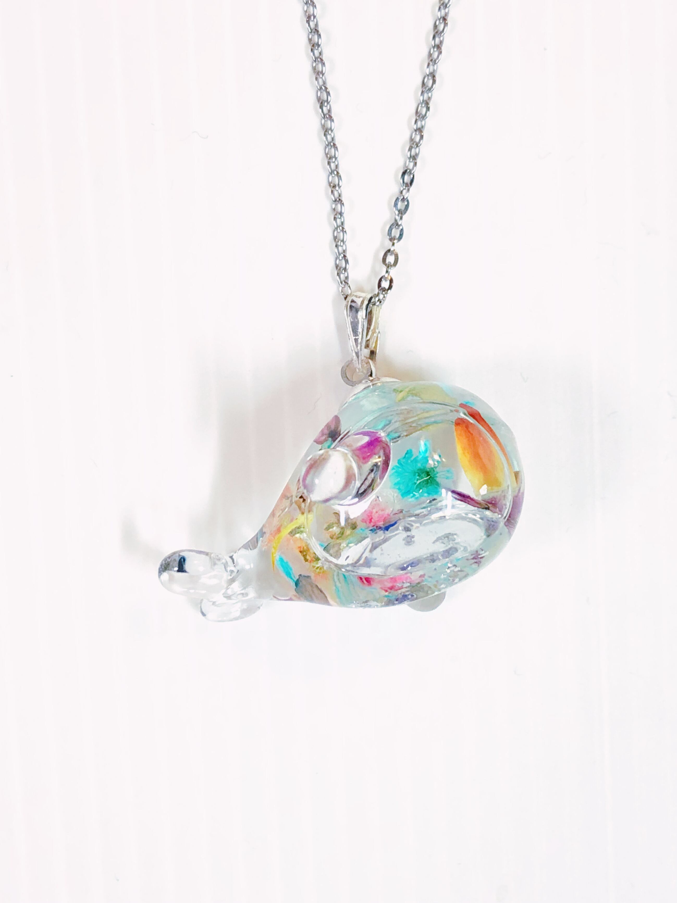 ガラスドームの クジラ の中に、銀箔やフラワーをふんだんに詰め込んだハンドメイドネックレスです。